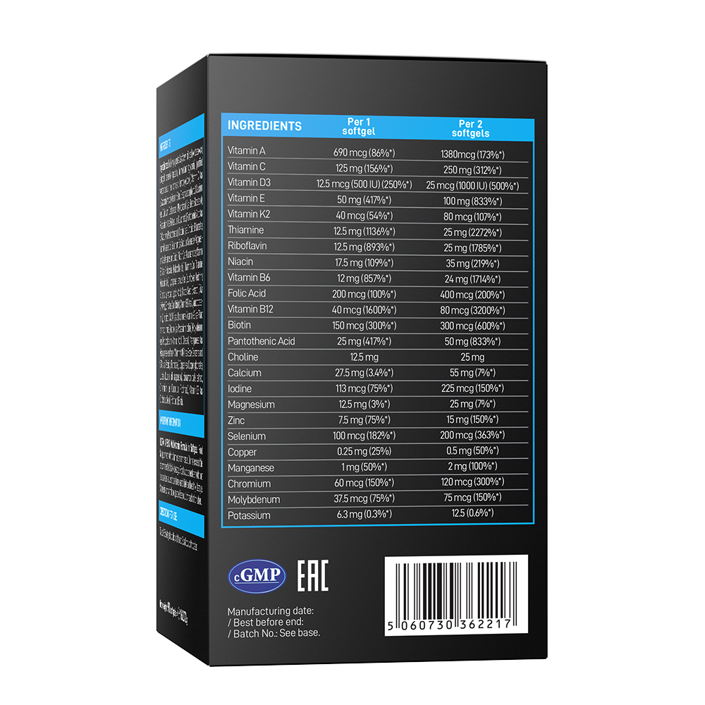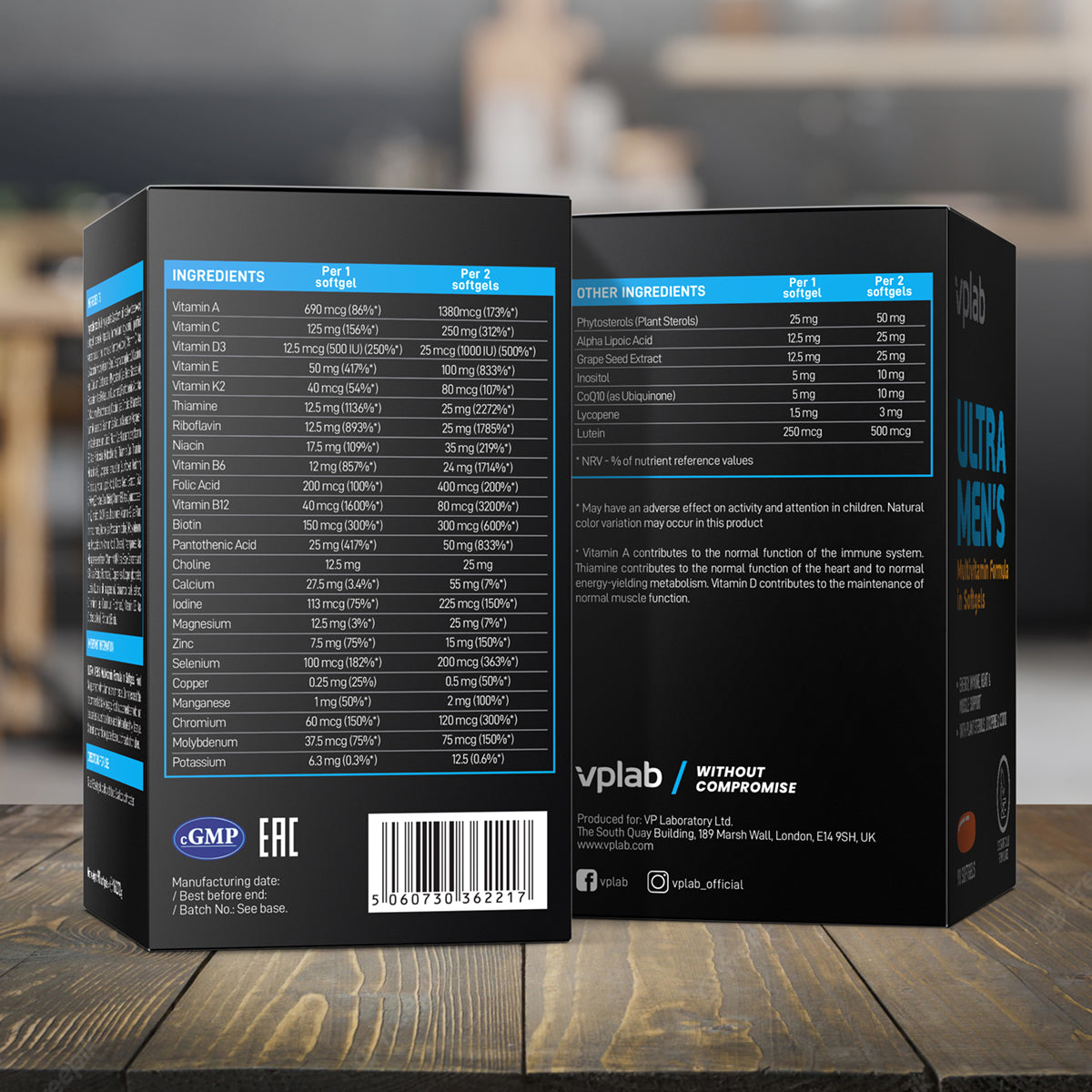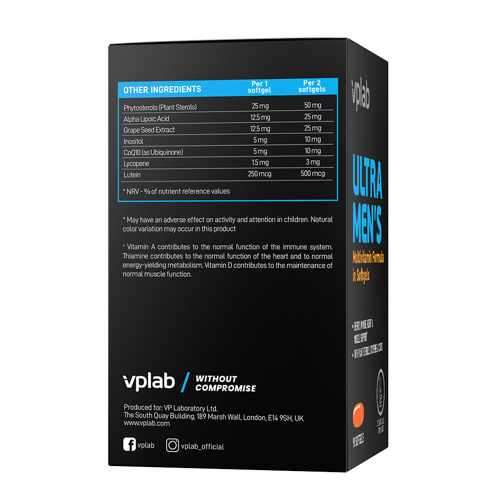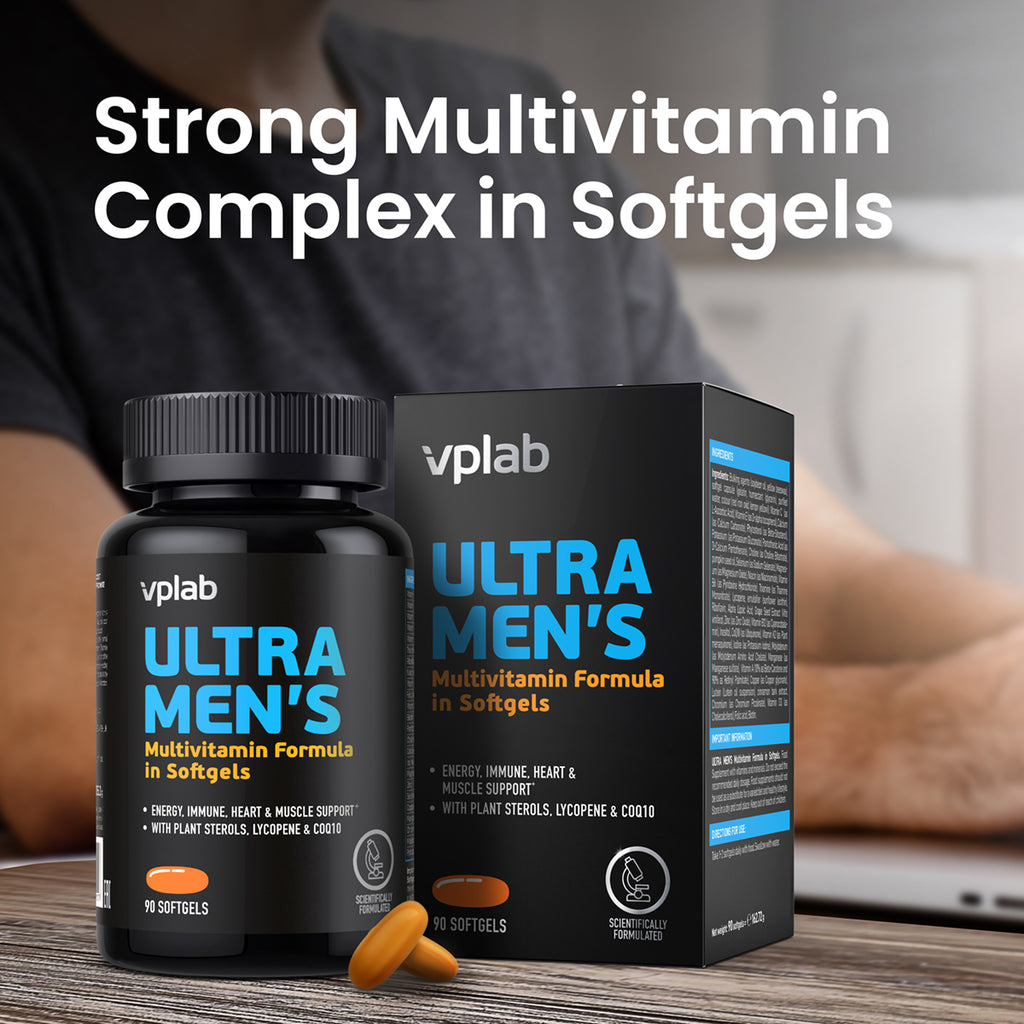 "Vplab" "Ultra Men's Multivitamin Formula" minkštosiose granulėse yra meistriškai sukurtas vyrų sveikatai, darbingumui ir gyvybingumui palaikyti. Ši išsami formulė - tai unikalus svarbiausių vitaminų ir mineralų mišinys, pritaikytas elektrolitų pusiausvyrai, raumenų funkcijai, baltymų sintezei ir kaulų sveikatai gerinti.