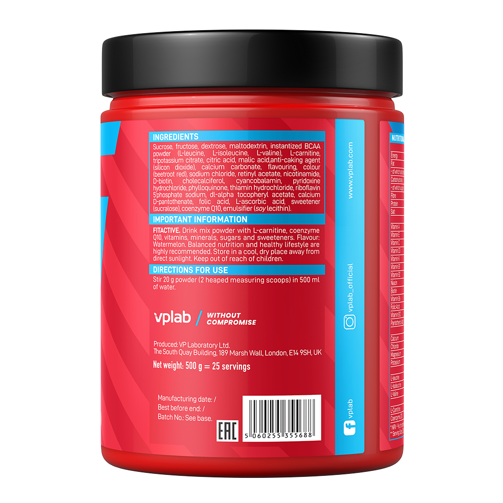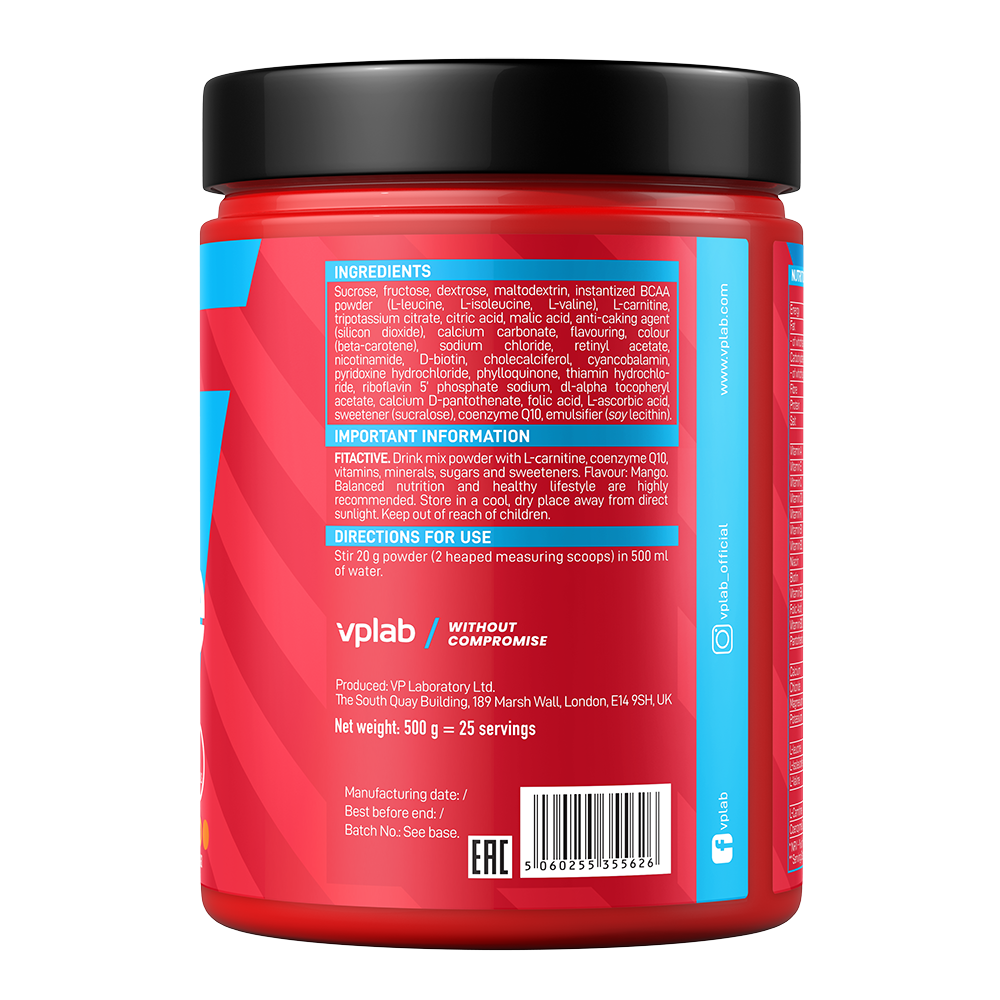 Ingredients:Sucrose, fructose, dextrose, maltodextrin, instantized BCAA powder (L-leucine, L-isoleucine, L-valine), L-carnitine, tripotassium citrate, citric acid, malic acid, anti-caking agent (silicon dioxide), calcium carbonate, flavouring, colour (сopperсhlorophyllin), sodium chloride, retinyl acetate, nicotinamide, D-biotin, cholecalciferol, cyancobalamin, pyridoxine hydrochloride, phylloquinone, thiamin hydrochloride, riboflavin 5’ phosphate sodium, dl-alpha tocopheryl acetate, calcium D-pantothenate, folic acid, L-ascorbic acid, sweetener (sucralose), coenzyme Q10, emulsifier (soy lecithin)