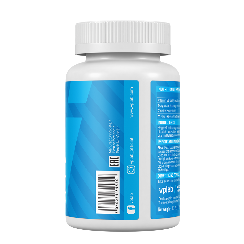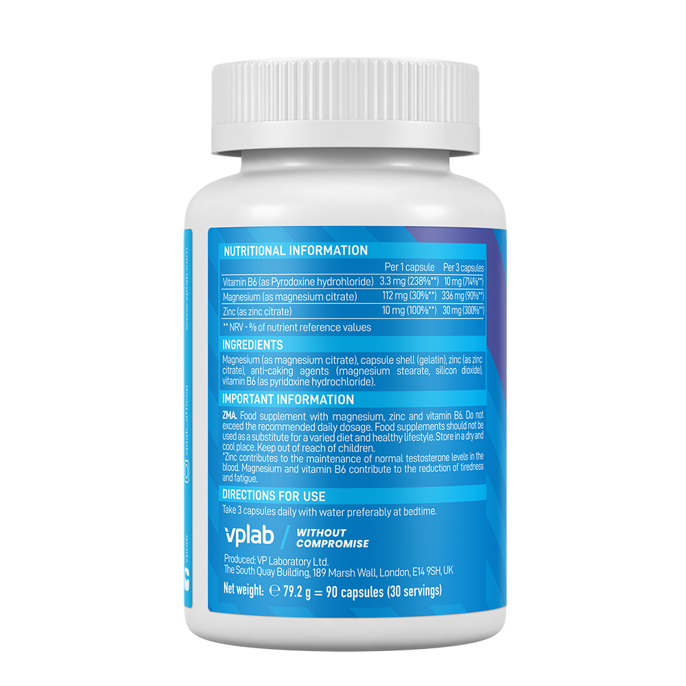 "Vplab" ZMA yra stiprus cinko, magnio aspartato ir vitamino B6 derinys, skirtas giliam atsigavimui palaikyti ir aukštam testosterono lygiui palaikyti. Ši formulė idealiai tinka raumenų stresui mažinti ir nervų sistemos atsigavimui spartinti. 90 lengvai nuryjamų kapsulių.