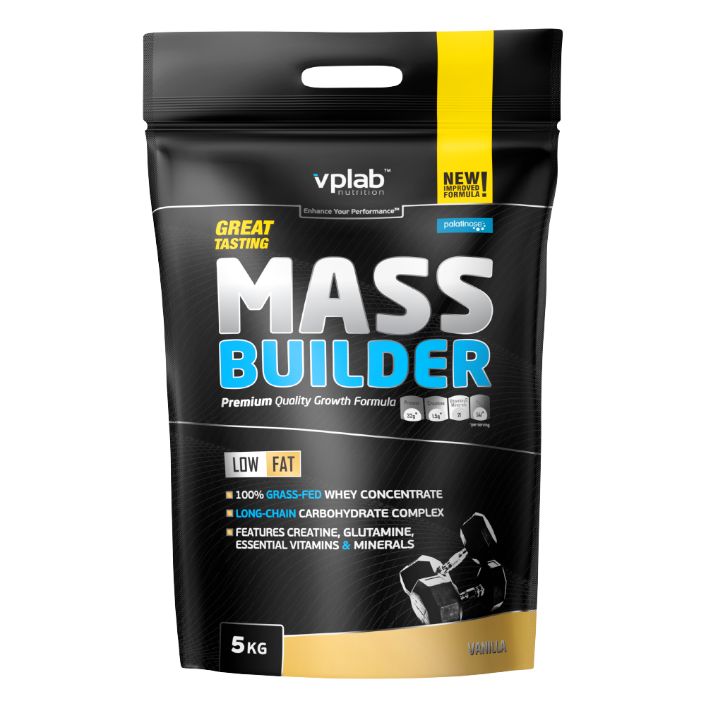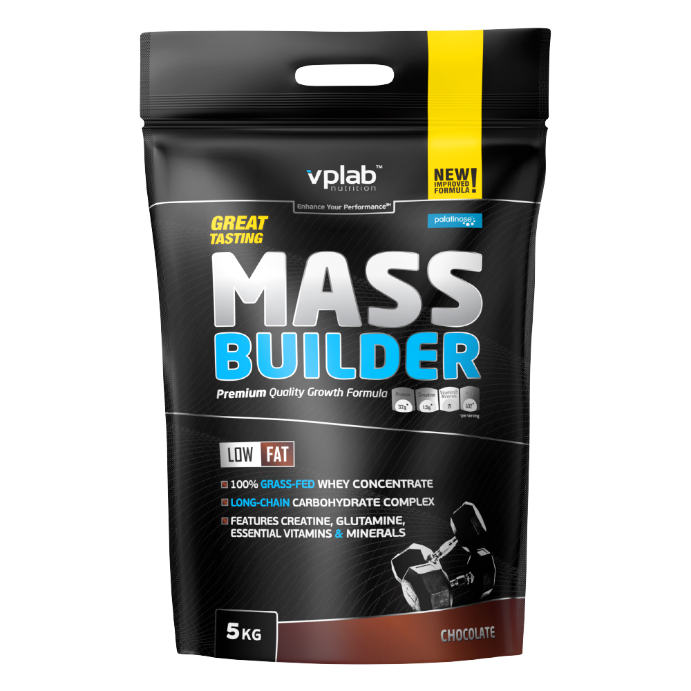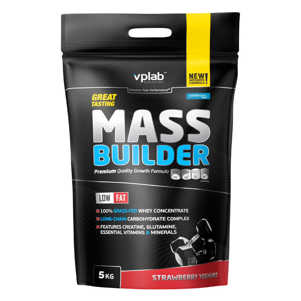 Mass Builder — viskas viename masės augintojas masės auginimo etapams ir didelio energijos poreikio treniruotėms. Sudėtyje: 100 % pievose ganomų karvių išrūgų baltymas, ilgos grandinės angliavandenių kompleksas su prebiotikais, „Creapure®“ kreatino monohidratas, L-glutaminas bei būtini vitaminai ir mineralai — praktiškas būdas vienu kokteiliu padidinti kalorijų ir baltymų kiekį.